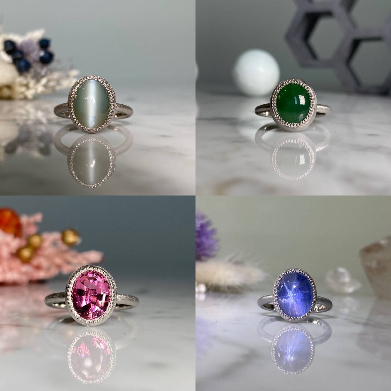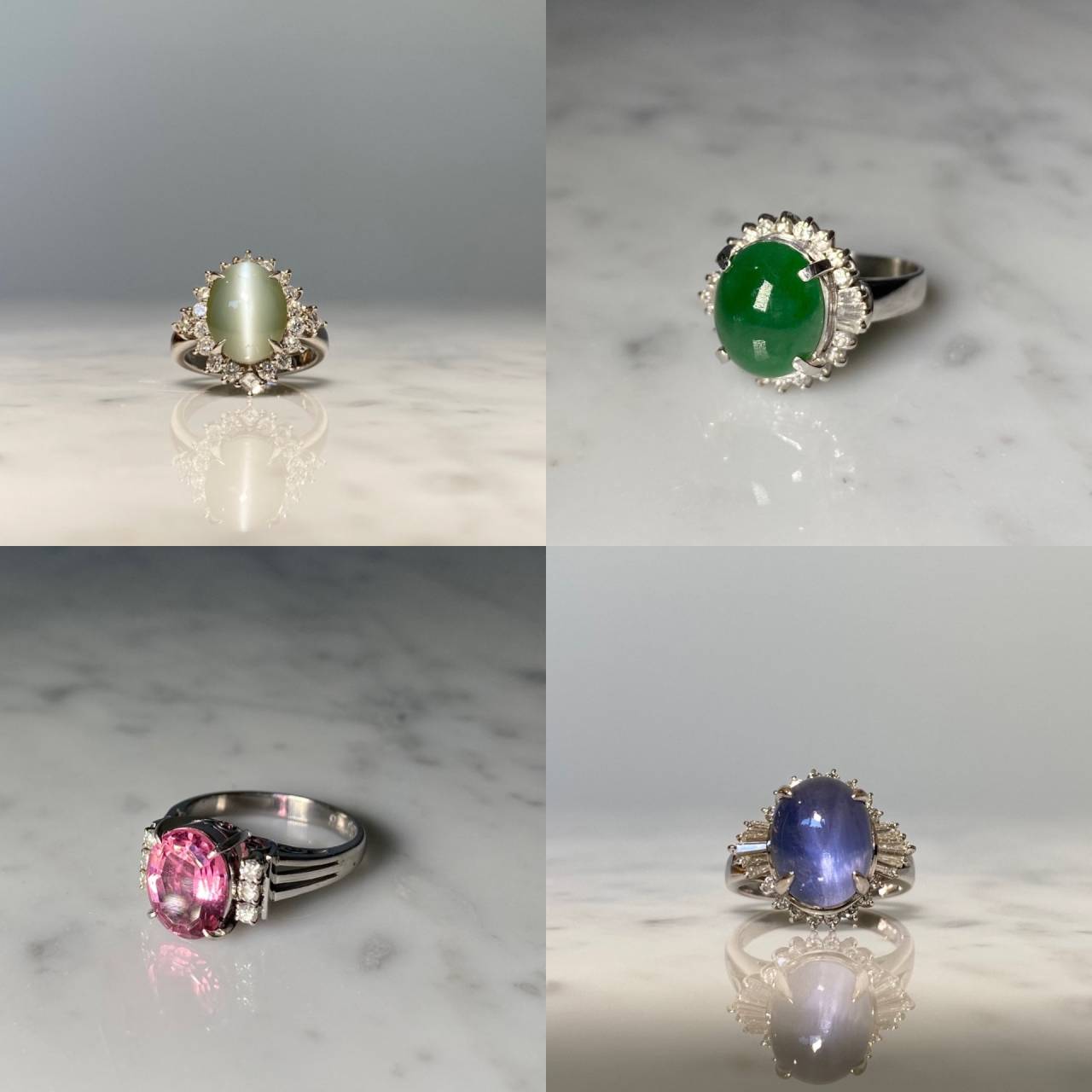 リフォームジュエリー 2025/04/24 リングリフォーム Pt900 クリソベリルキャッツアイ 翡翠 ピンクトルマリン スターサファイア (after 写真1 before 写真2) 指輪4点のリフォームです。 艶消し加工を施し、石の個性が輝くようにシンプルに仕上げました。 ファッションのポイントにもなり、普段使いしやすい作品です。 ご注文誠にありがとうございました。