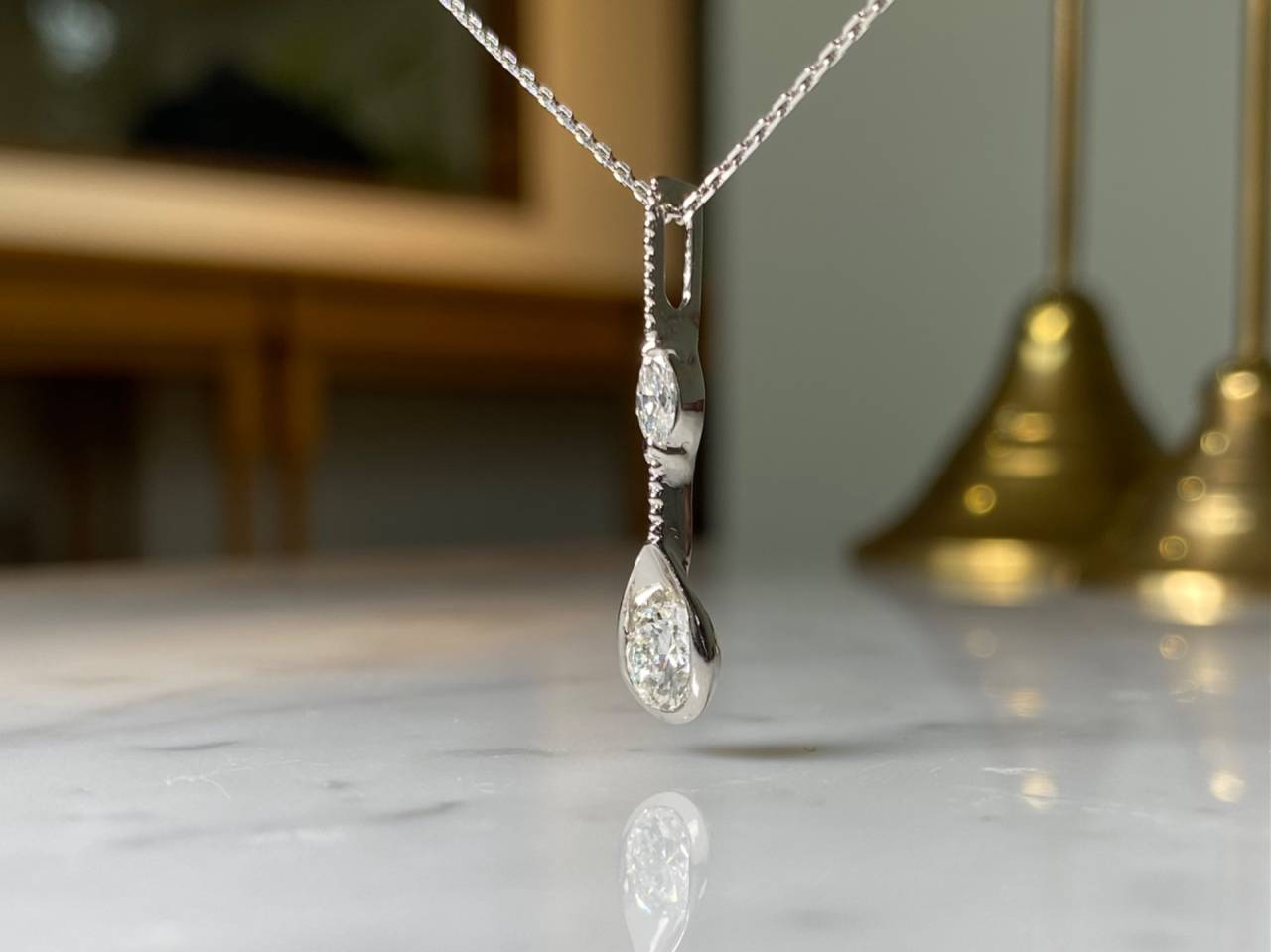 リフォームジュエリー 2025/05/08 ペンダントトップ Pt900 ダイヤモンド (after 写真1、2 before 写真3) 指輪からペンダントトップへのリフォームです。 雫が落ちる繊細な姿を表現した作品。 ペアシェイプカットに見えるような鏡面加工を施し、ダイヤモンドがより輝きを放ちます。 ご注文誠にありがとうございました。