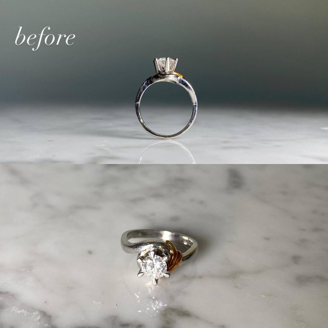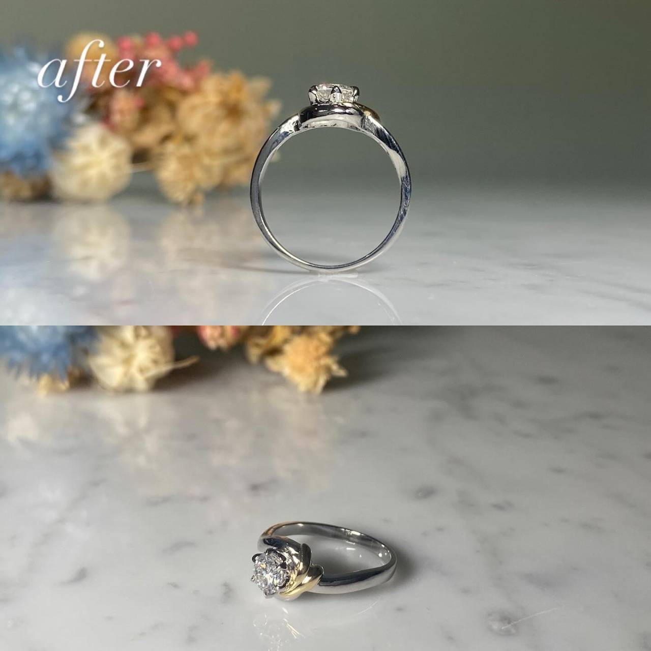 リフォームジュエリー 2025/06/12 指輪リフォーム Pt900 ダイヤモンド (after 写真1 before 写真2) 指輪のリフォームです。 高さのある立て爪を、デザインはそのままに座を低く、普段使いしやすいように作製しました。 ご注文誠にありがとうございました。