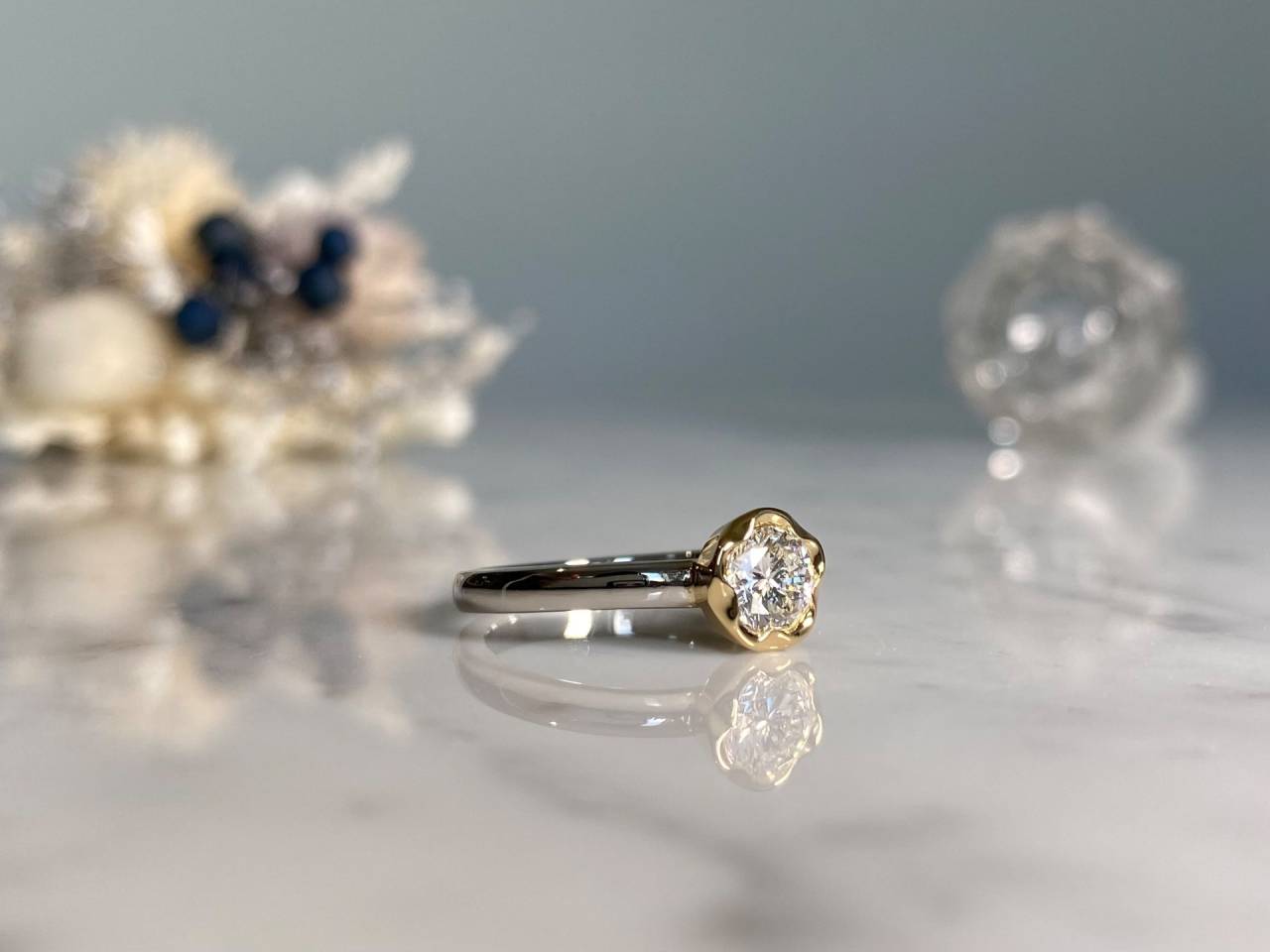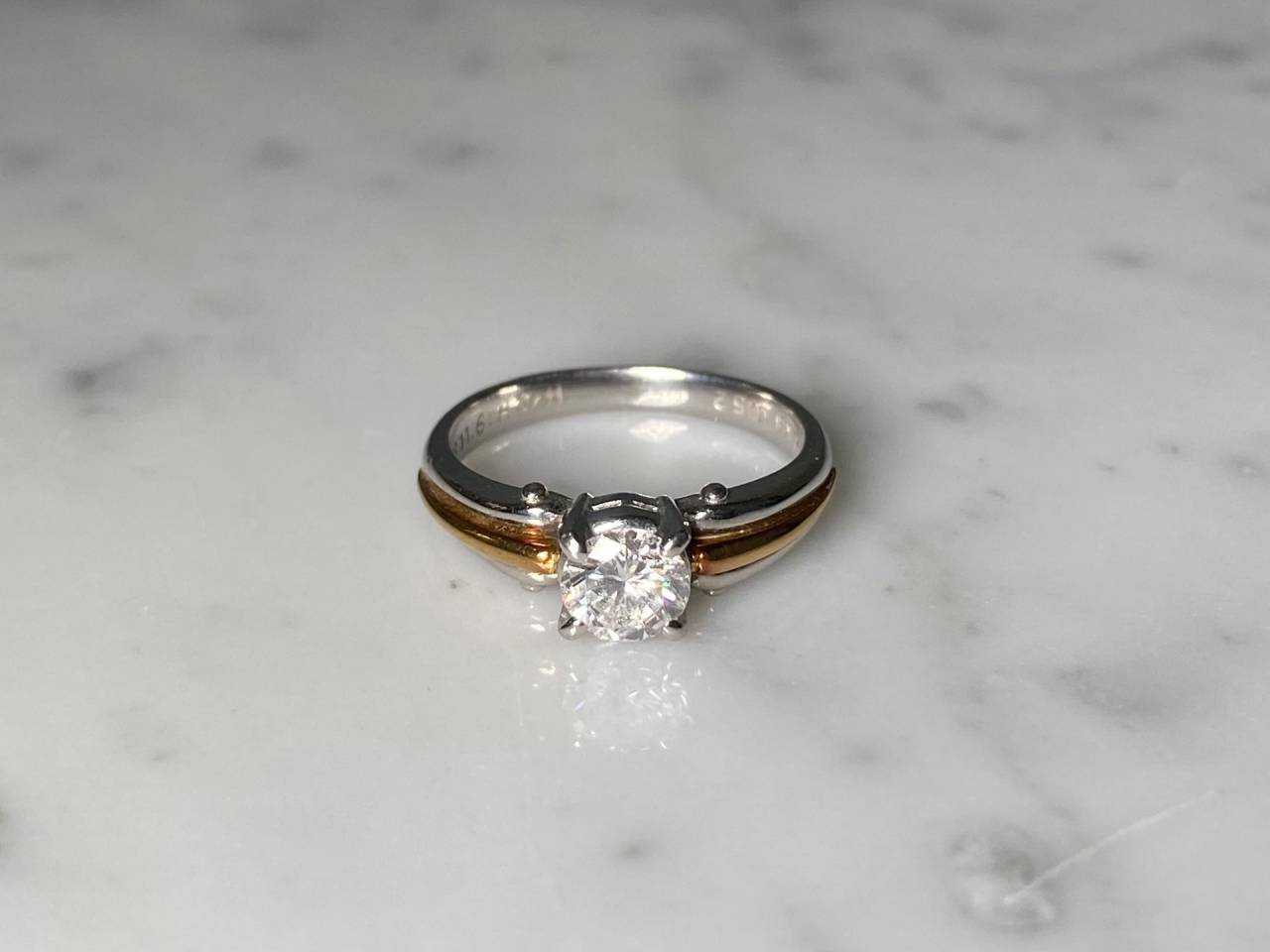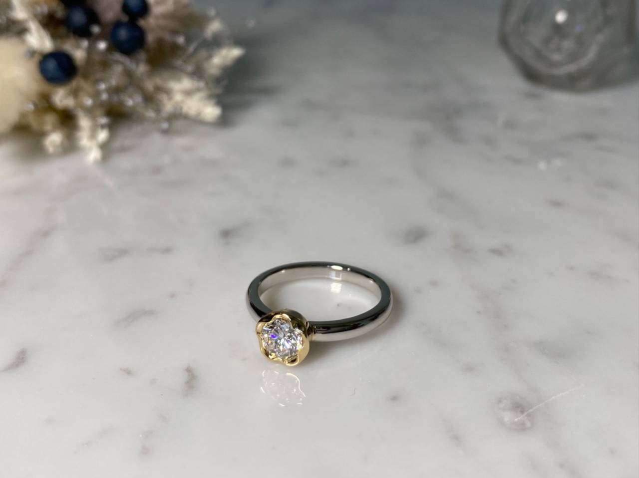 リフォームジュエリー 2025/11/07 ダイヤモンドコンビリング Pt900 K18YG ダイヤモンド (after 写真1〜3 before 写真4) 指輪のリフォームです。 Pt900の甲丸リングに、K18YGで作製した緩やかなアウトラインの枠にダイヤモンドを合わせた作品。 華やかで優しい印象の作品に仕上がりました。 ご注文誠にありがとうございました。