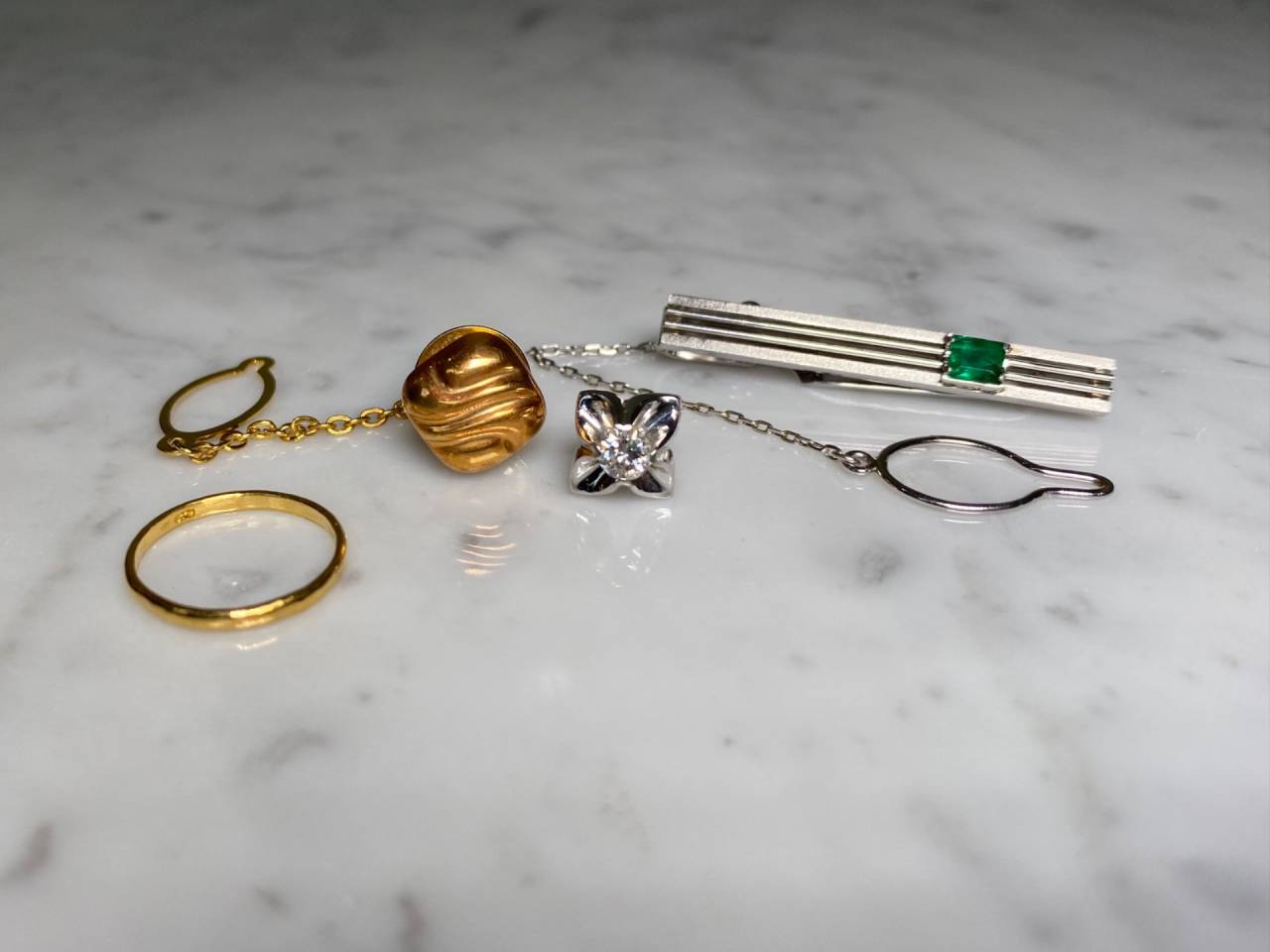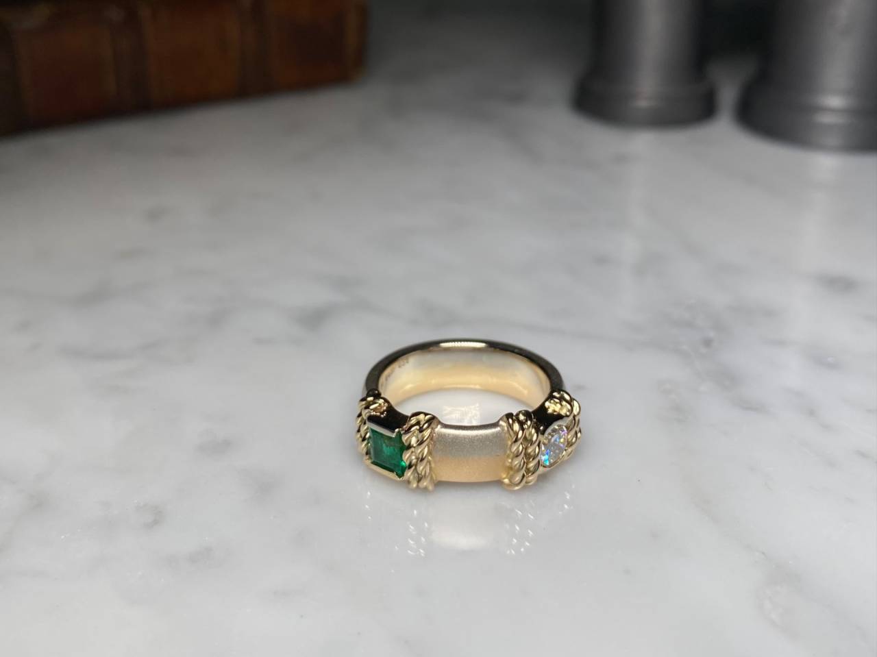 リフォームジュエリー 2026/01/22 エメラルド×ダイヤモンドring K18YG K14WG エメラルド ダイヤモンド (after 写真1、2 before 写真3) お持ち込みいただいた素材を使用して、指輪を作製しました。 アームは、K18YGとK14WGの2色の地金を使用し、よりコントラストが出るように艶消し加工を施しました。 綱をイメージした飾りを、エメラルドとダイヤモンドの両サイドに配置し、アンティーク調に仕上げた作品です。 ご注文誠にありがとうございました。