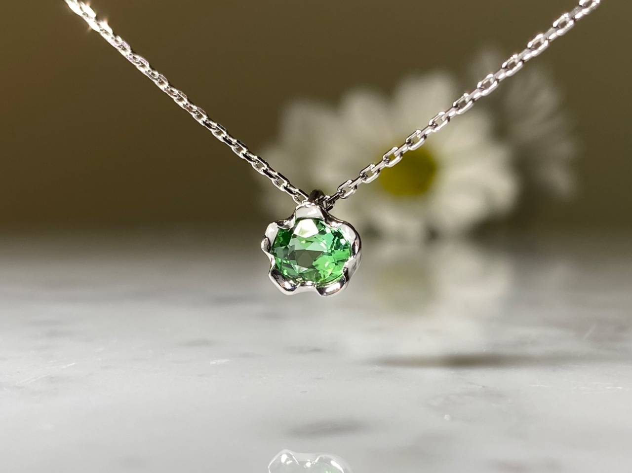 フルオーダー 2026/01/23 Pt900パライバトルマリンネックレス Pt900 パライバトルマリン 展示品のパライバトルマリンをお選びいただき、ネックレス作製しました。 鮮やかで透き通ったネオングリーンカラーのパライバトルマリンを、柔らかな印象の5枚花弁枠にセットしました。 パッと目を惹く魅力的な作品です。 ご注文誠にありがとうございました。