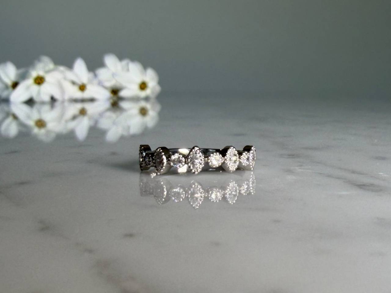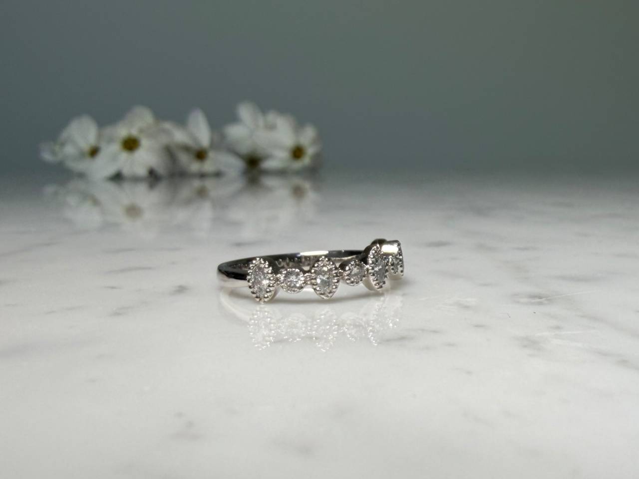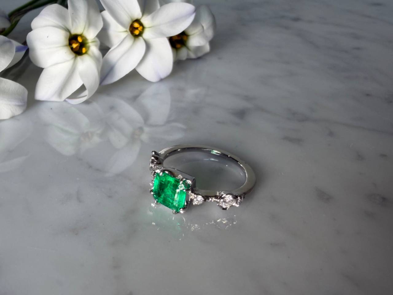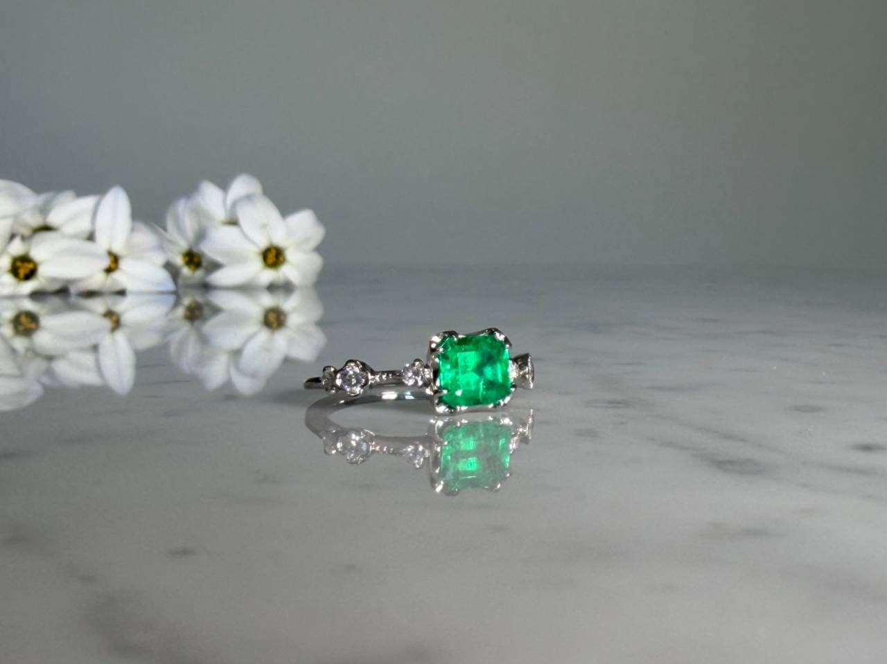リフォームジュエリー 2026/04/09 Pt900エメラルド×ダイヤモンドリング Pt900ダイヤモンドリング Pt900 エメラルド ダイヤモンド (after1〜5 before 写真6) お持ち込みいただいた素材を使用して指輪2点を作製しました。 額縁をイメージした枠にエメラルドをセットし、小花のダイヤモンドを添えた作品。 マーキスカットとラウンドカットのダイヤモンドを交互に配置した一文字リング。 どちらもスッキリとしたデザインで、指先を美しく彩ります。 ご注文誠にありがとうございました。