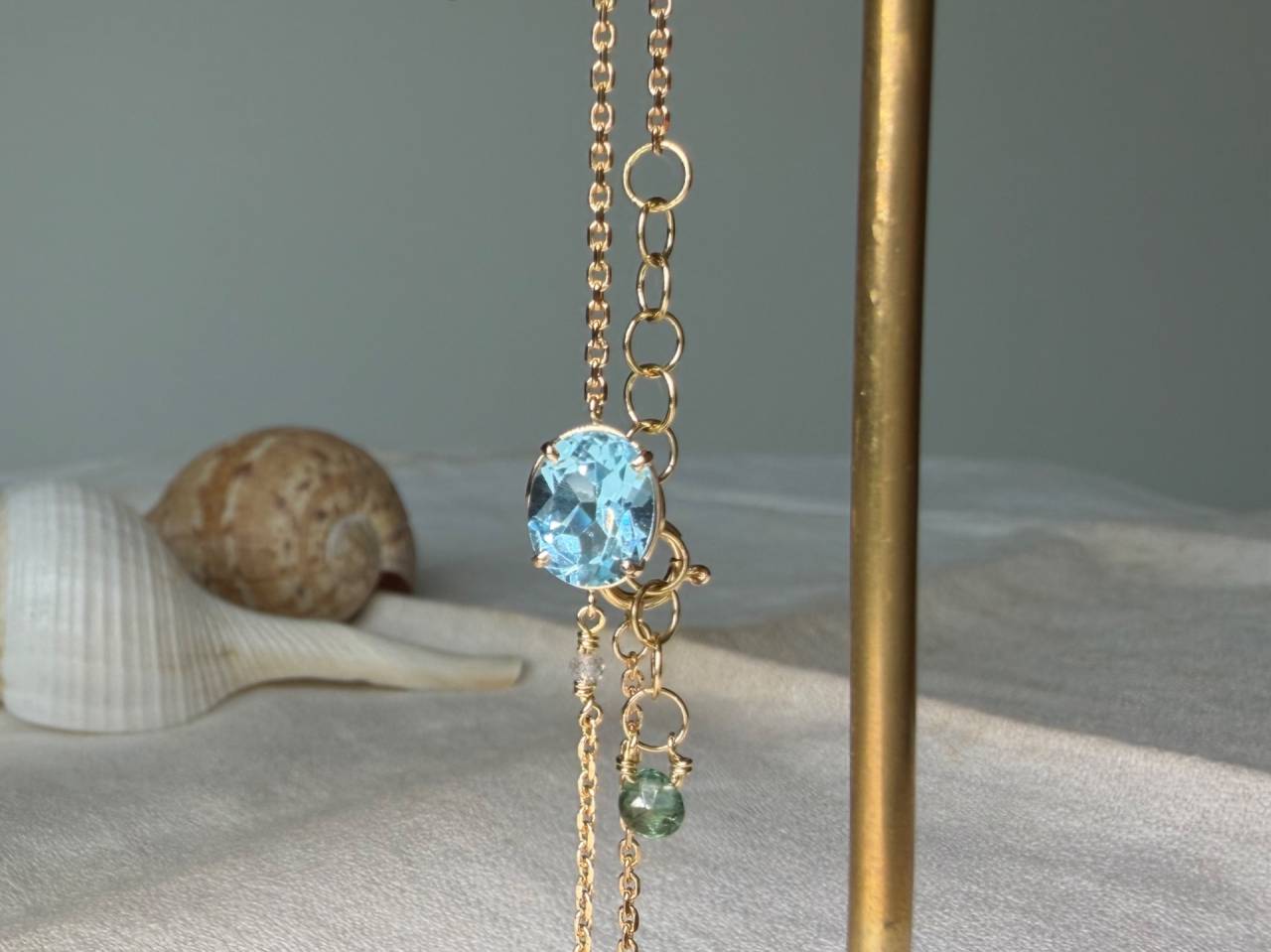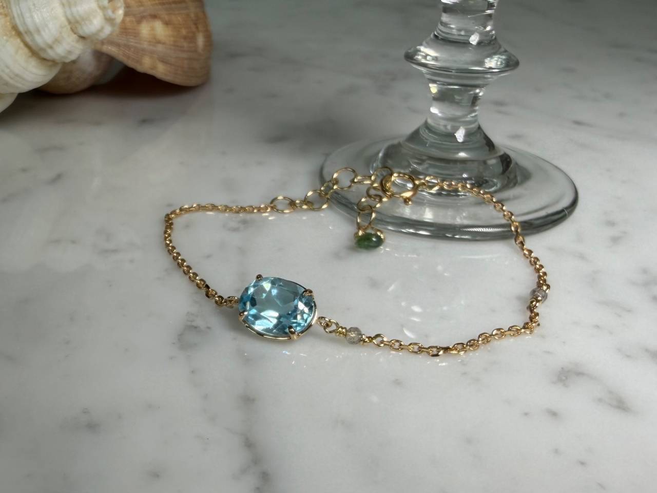 フルオーダー 2026/04/15 K18YG アクアマリン ブレスレット K18YG アクアマリン グリーントルマリン ラブラドライト 瑞々しく透明感のあるアクアマリンが魅力的なブレスレット。 アクセントにラブラドライト、エンドチャームにはグリーントルマリンがセットされた華奢で上品な作品です。 ご注文誠にありがとうございました。